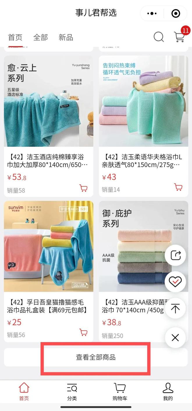 如果想查看某一品类,比如成人浴巾,可以点击该品类下方“查看全部商品”按钮。